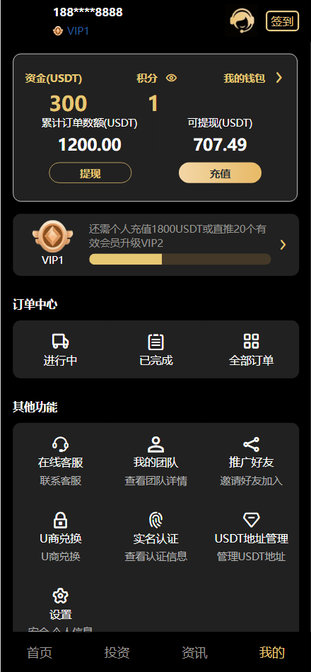 有签到、积分商城、团队推广,冲提都是USDT,带有一个部署文件